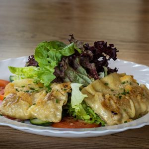 Großer Salatteller / gebratene Maultaschen / Semmelbrösel-Schmelze